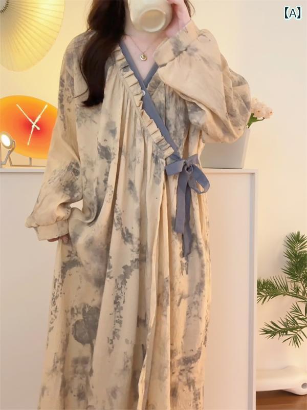 ガウン 快適 着心地 女性用 パジャマ 夏 2025新 スタイル クラウド コットン ナショナル タイ ダイ ナイトガウン スイート ロング ナイトドレス バスローブ ホームウェア 春