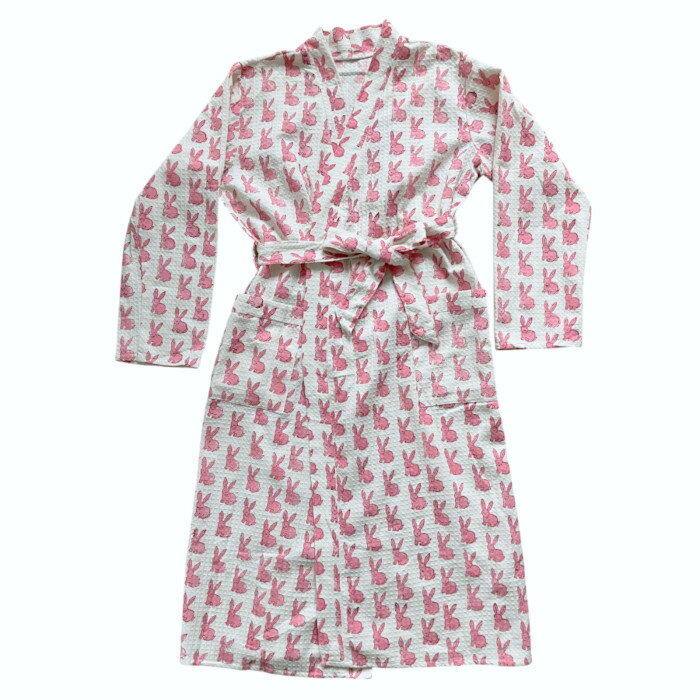インド ブロックプリント ワッフル生地 バスローブ ガウン キャット 女性用 Fサイズ 猫 レディース うさぎ ラビット キャット