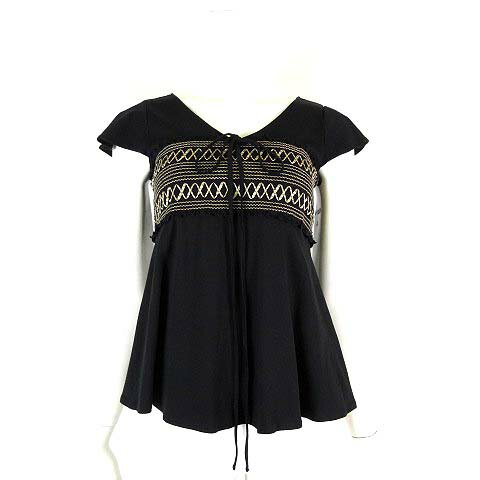 【中古】ルイシャンタン Lui Chantant カットソー ブラウス プルオーバー ペプラム Vネック リボン 刺繍 フリル 切替 コットン キャップスリーブ 半袖 M 38 黒 ブラック ベージュ レディース 【ベクトル 古着】 250603