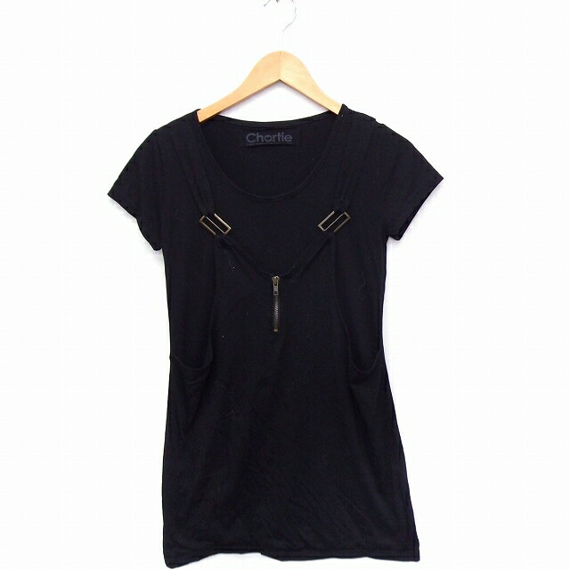 【中古】Chortie チュニック レイヤード風 金具 ジッパー 丸首 半袖 M ブラック 黒 /FT38 レディース 【ベクトル 古着】 210429