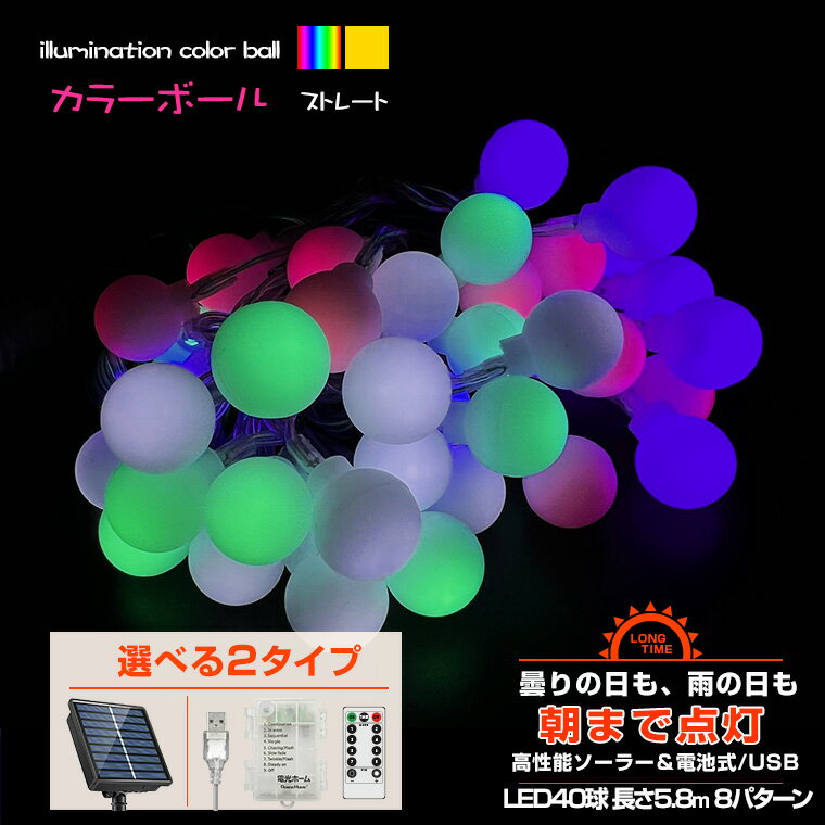 イルミネーション カラーボール ライト ストレート 40球 長さ約5.8m ソーラー or 電池式 & USB 給電 LEDライト ガーランド ライト ストリングライト イルミネーション ハロウィン クリスマス 飾り