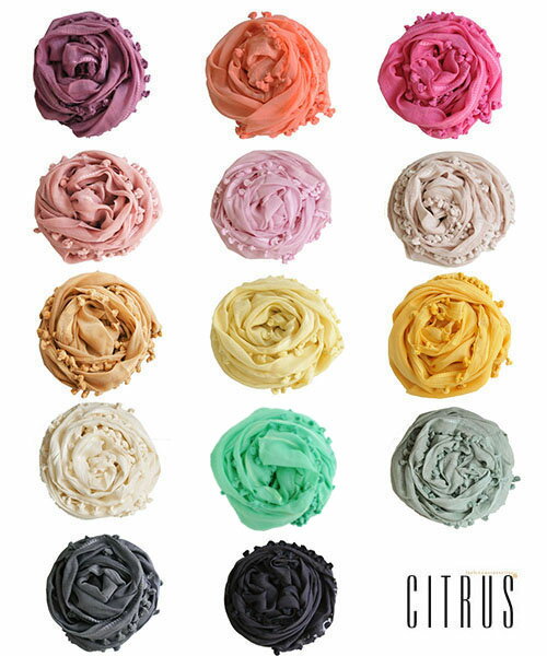 CITRUS 無地POMPOM付き コットン × シルク ストール 大人気のシトラスのポンポン付きストールです。 生地はコットンとシルクを使用したサラッとした肌触りの春夏仕様。 大判タイプなので、いろいろな巻き方のアレンジがお楽しみ頂けます。 サイズ ■ 全長 約 95 cm × 200 cm 素 材 ■ コットン 60 %、シルク 40 %、(ポンポン)コットン 100% ご注意事項 ■ ハンドメイドのため、大きさには個体差がございます。 ■ デリケートな素材のため、アクセサリーなどによる引っかけにご注意ください。 ■ ラフな作りの商品となっております。次のような商品品質に対するクレームは受け付けておりませんのであらかじめご了承ください。色むら、染み、生地に天然の繊維が入り込んだ黒っぽい点・線、シワ、ネップ、織り傷、織りむら、小さな傷、小さな穴、引き攣れ、ポンポンの付き方があまい、プリントの商品はプリントのずれ、刺繍の模様の抜け、ビーズやミラーワークの商品は、若干のパーツの抜けや取れ、など。 ■ 商品は太陽光をメインに撮影しております。実際の色に近づけるよう努力しておりますが、ご使用のモニター環境によっては実際の色と差が生じる場合がございます。