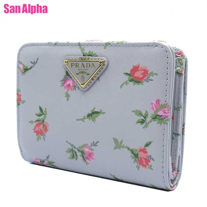 プラダ 財布 二つ折り財布 (小銭入れあり) PRADA PORTAF.PICCOLO LAMPO レザー トライアングル ロゴプレート フラワーローズ プリント コーナージップ ミディアム ウォレット 1ML018 VITELLO ROSE / PERLA (スモークブルー系マルチ) アウトレット レディース 送料無料