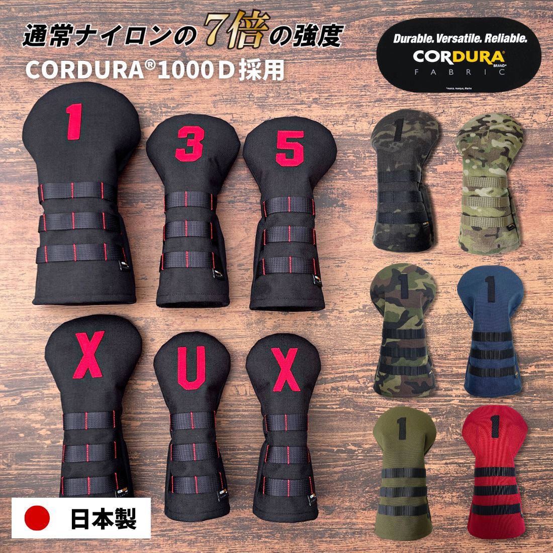 【商品情報】品名:MADE IN JAPAN CORDURA1000D×最高級本革ヘッドカバー素材:CODURA1000D(表面)、ボア(内側)、最高級グレインレザー(ブランドタグ)【商品説明】ナイロンの7倍の強度を誇り、軍事用品やアウトドア、スポーツシーンで採用されるCORDURA®を使用したヘッドカバーになります。ブランドの主張を抑えシンプルに仕上げられたヘッドカバーはどんなキャディバッグにも合わせやすく高級感を演出します。業界トップクラスの豊富な番手ラインナップであなただけのセッティングを実現します。▼ウッドラインナップ▼▼ユーティリティラインナップ▼▼豊富なカラーバリエーション▼生地の裁断から縫製、刺しゅうまで自社で一貫製造しております。カバン製造で培った技術を詰め込み、メイドインジャパンだからできる高品質ヘッドカバーを手に取ってみてください。MULTICAM®(マルチカム)柄の生地はMADE IN USAの正規品でMULTICAM®Fabricのオフィシャルサプライヤーより輸入しております。柄をコピーをした模造生地とは性能、耐久性において大きな違いがございますのでご注意ください。ヘッドカバー1個毎にCORDURA®の正規品を証明するピスネームが縫い付けられております。※CODURA®はアメリカのインビスタ社の登録商標です。ミリタリーを彷彿させるステンシル文字を刺しゅうしてあります。高級感を追求するため、各カラー毎に番号の色が異なる仕様となっております。通常の刺しゅうより高密度な設定にすることで立体感のある仕上がりを実現しました。ミリタリー要素の強いヘッドカバーのアクセントに最高級グレインレザーのブランドタグを縫い付け、トレンド感も取り入れたおしゃれな仕上がりとなってます。カラー:マルチカムブラックとグレーにはブラックのレザーを採用し、シックな仕上がりとなっています。絞りの強さにもこだわっており、丁度よくクラブを保持します。内側には肉厚のボアを採用し、クラブをしっかり守ります。ROBUSTIN(ロブスティン)は、日本国内、海外に製造拠点を持つファクトリーブランドです。ラグジュアリーブランドのヘッドカバー製造も請け負っております。一切の中間業者を排除することで、ラグジュアリーブランドのクオリティのオリジナル商品をお手頃価格にてご提供いたします。