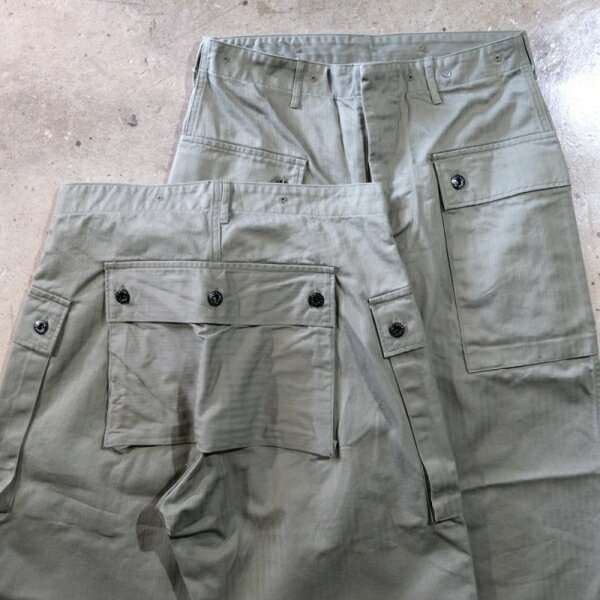 ■品名: Crawling Pants / USMC M-44 ■素材: COTTON100% ■商品: TCBの所有するビンテージ40's USMC (U.S.MARINE CORPS) M-44をベースに製作されたCrawling Pants。 手榴弾や食料を入れるのに使われていた特徴的な大きな後ろポケット、野戦用のための匍匐前進や前傾姿勢を想定したデザイン。 オリジナルで作製されたTCB MARINE CORP刻印入りラッカーボタンは履き込むほどに少しづつ色が剥げてきます。 帯部分と裾のアイレット、1900年代初頭の菊穴用ミシンSINGER99で開けられた本菊穴仕様。 素材はUSMC用に開発されたヘリンボン素材を忠実に再現。 右綾の部分は糸の撚りをS撚り、左綾の部分はZ撚りと、撚り糸の方向を使い分けることにより、当時のようなコントラストの強い表情になっています。 ※画像と商品の風合い、色が若干異なる場合もあります。 また各サイズも1商品ずつ若干異なることもありますのでご了承ください。 サイズ感に関しては好みもありますのであくまでもご参考程度にお願い致します。 ウォッシュ済のため縮具合も個体差がありますのでご了承下さい。お問合せにてご連絡頂ければ現品計測させていただきます。 【SIZE】 ウエスト 股上 わたり 股下 裾幅 30 78cm 30cm 32cm 75cm 21cm 32 82cm 31cm 33cm 75cm 22cm 34 86cm 32cm 34cm 76cm 23cm 36 91cm 32cm 36cm 77cm 24cm ※ワンウォッシュ済 ※着用参考:175cm 70kg W34着用 ※万一返品・交換される方は返品の送料・再送の際に発生する送料はご負担いただきますのでご了承ください。