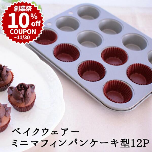 \創業祭 P10倍★10%OFFクーポン/ マフィン型 12個 ベイクウェアー ミニマフィン パンケーキ型12Pレート型 富士ホーロー カップケーキ型 |