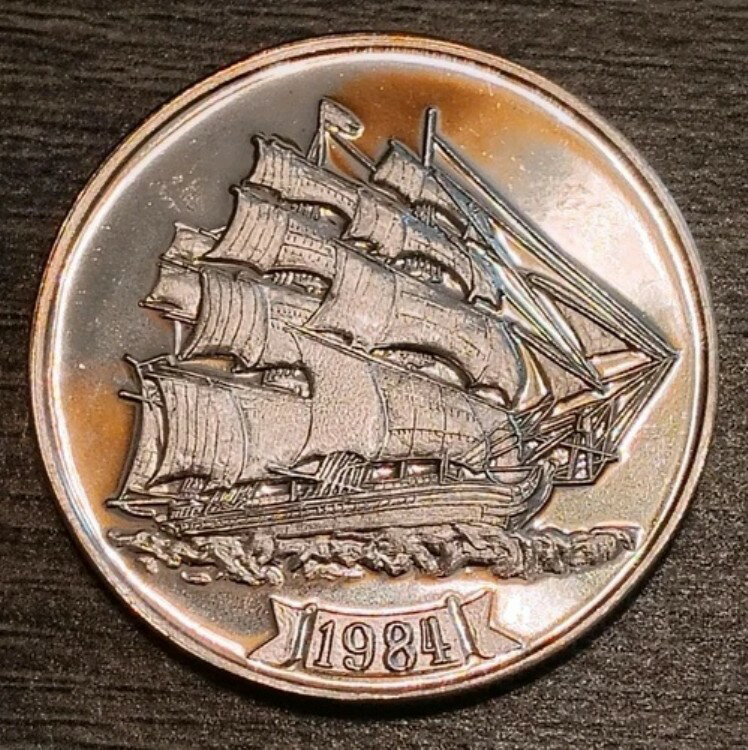 希少ヴィンテージ 1984年 ダンのビッグアイアンガレオン船と大砲 1オンス .999 シルバーラウンド