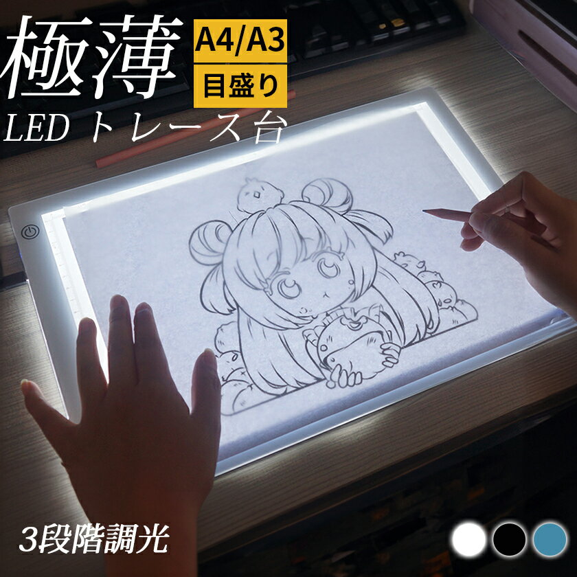 トレース台 薄型 LED A4 A3 三階段調光 無階段調光 USB給電 コード付き ルーラー 目盛り 色つけ トレーシング イラスト 製図 アニメ コミック キャラクター LED ダイヤモンドアート トレス台 トレース プレゼント ブラック ホワイト ブルー ライトテーブル 海外通販