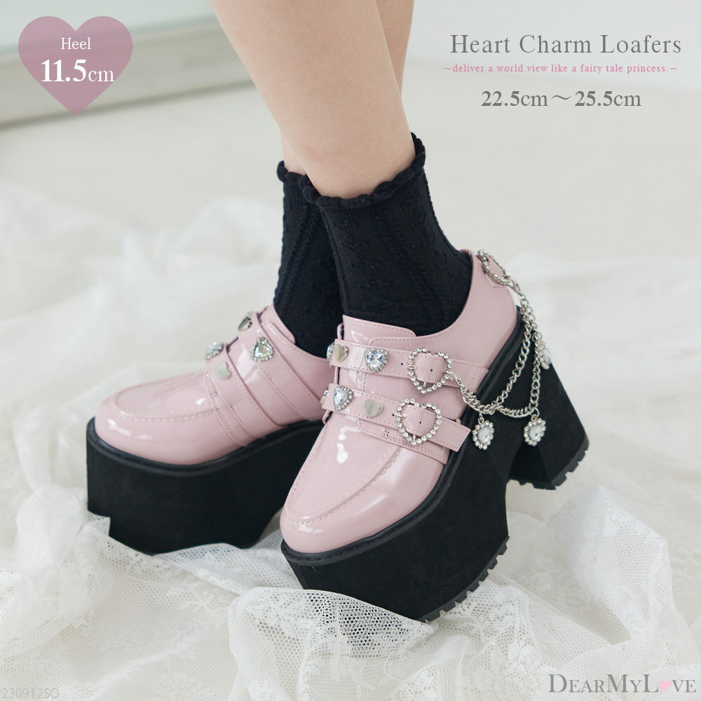 キラキラハートチャームチェーン付きダブルハートローファー レディース 靴 ローファー 春 夏 秋 冬 ピンク×ホワイト サックス ピンク×ブラック ブラック 22.5 23.0 23.5 24.0 24.5 25.0 25.5 DearMyLove 量産型 地雷系 参戦服 ロリータ ゴスロリ 夢展望