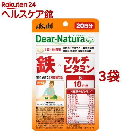 お店TOP>健康食品>ミネラル>鉄>鉄分>ディアナチュラスタイル 鉄*マルチビタミン 20日分 (20粒*3袋セット)商品区分:栄養機能食品(栄養成分:ビタミンA、ビタミンB1、ビタミンB2、ビタミンB6、ビタミンB12、ビタミンC、ビタミンE)【ディアナチュラスタイル 鉄*マルチビタミン 20日分の商品詳細】●ビタミンA、ビタミンB1、ビタミンB2、ビタミンB6、ビタミンB12、ビタミンC、ビタミンEの栄養機能食品です。●1粒に14種類のビタミンと1日に必要な2.6倍量の鉄が入っています。●無香料・無着色、保存料無添加です。栄養機能食品。●ビタミンAは、夜間の視力の維持を助けるとともに、皮膚や粘膜の健康維持を助ける栄養素です。●ビタミンB1は、炭水化物からのエネルギー産生と皮膚や粘膜の健康維持を助ける栄養素です。●ビタミンB2は、皮膚や粘膜の健康維持を助ける栄養素です。●ビタミンB6は、たんぱく質からのエネルギー産生と皮膚や粘膜の健康維持を助ける栄養素です。●ビタミンB12は、赤血球の形成を助ける栄養素です。●ビタミンCは、皮膚や粘膜の健康維持を助けるとともに、抗酸化作用を持つ栄養素です。●ビタミンEは、抗酸化作用により、体内の脂質を酸化から守り、細胞の健康維持を助ける栄養素です。【栄養成分(栄養機能食品)】ビタミンA、ビタミンB1、ビタミンB2、ビタミンB6、ビタミンB12、ビタミンC、ビタミンE【保健機能食品表示】・ビタミンAは、夜間の視力の維持を助けるとともに、皮膚や粘膜の健康維持を助ける栄養素です。・ビタミンB1は、炭水化物からのエネルギー産生と皮膚や粘膜の健康維持を助ける栄養素です。・ビタミンB2は、皮膚や粘膜の健康維持を助ける栄養素です。・ビタミンB6は、たんぱく質からのエネルギー産生と皮膚や粘膜の健康維持を助ける栄養素です。・ビタミンB12は、赤血球の形成を助ける栄養素です。・ビタミンCは、皮膚や粘膜の健康維持を助けるとともに、抗酸化作用を持つ栄養素です。・ビタミンEは、抗酸化作用により、体内の脂質を酸化から守り、細胞の健康維持を助ける栄養素です。【召し上がり方】1日1粒を目安に、水またはお湯とともにお召し上がりください。【品名・名称】鉄・ビタミン加工食品【ディアナチュラスタイル 鉄*マルチビタミン 20日分の原材料】デキストリン/V.C、ピロリン酸鉄、セルロース、イノシトール、V.P、ナイアシン、酢酸V.E、糊料(プルラン)、パントテン酸Ca、ステアリン酸Ca、V.B6、V.B2、V.B1、V.A、葉酸、ビオチン、V.D、V.B12、(一部に乳成分を含む)【栄養成分】1日1粒(360mg)あたりエネルギー 1.22kcal、たんぱく質 0.024g、脂質 0.018g、炭水化物 0.24g、食塩相当量 0.0031g、ビタミンA 450μg(58%)、ビタミンB1 1.0mg(83%)、ビタミンB2 1.1mg(79%)、ビタミンB6 1.0mg(77%)、ビタミンB12 2.0μg(83%)、ビタミンC 80mg(80%)、ビタミンE 8.0mg(127%)、ビタミンD 5.0μg、ナイアシン 11mg、パントテン酸 5.5mg、葉酸 200μg、ビオチン 45μg、鉄 18.0mg、ビタミンP 10mg、イノシトール20mg( )内の数値は栄養素等表示基準値(18歳以上、基準熱量2200kcal)に占める割合です。【保存方法】直射日光・高温多湿を避け、常温で保存してください。【注意事項】・本品は、多量摂取により疾病が治癒したり、より健康が増進するものではありません。・1日の摂取目安量を守ってください。・乳幼児・小児は本品の摂取を避けてください。・妊娠3ヵ月以内または妊娠を希望する女性は過剰摂取にならないよう注意してください。・原材料名をご確認の上、食物アレルギーのある方はお召し上がりにならないでください。・体調や体質によりまれに身体に合わない場合や、発疹などのアレルギー症状が出る場合があります。その場合は使用を中止してください。・小児の手の届かないところに置いてください。・水濡れにより変色する場合がありますので、水滴や濡れた手でのお取扱いにご注意下さい。・ビタミンB2により尿が黄色くなることがあります。・天然由来の原料を使用しているため、斑点が見られたり、色むらやにおいの変化がある場合がありますが、品質に問題ありません。・開封後はお早めにお召し上がりください。・品質保持のため、開封後は開封口のチャックをしっかり閉めて保管してください。・本品は、特定保健用食品と異なり、消費者庁長官による個別審査を受けたものではありません。・食生活は、主食、主菜、副菜を基本に、食事のバランスが重要です。【原産国】日本【ブランド】Dear-Natura(ディアナチュラ)【発売元、製造元、輸入元又は販売元】アサヒグループ食品※説明文は単品の内容です。商品に関するお電話でのお問合せは、下記までお願いいたします。菓子、食品、健康食品、医薬品・指定医薬部外品、サプリメント、スキンケアなど:0120-630611ミルク、ベビーフード、乳幼児用品専用:0120-889283リニューアルに伴い、パッケージ・内容等予告なく変更する場合がございます。予めご了承ください。(Dear-Natura StyLe 鉄×マルチビタミン 鉄Xマルチビタミン)・単品JAN:4946842636648アサヒグ