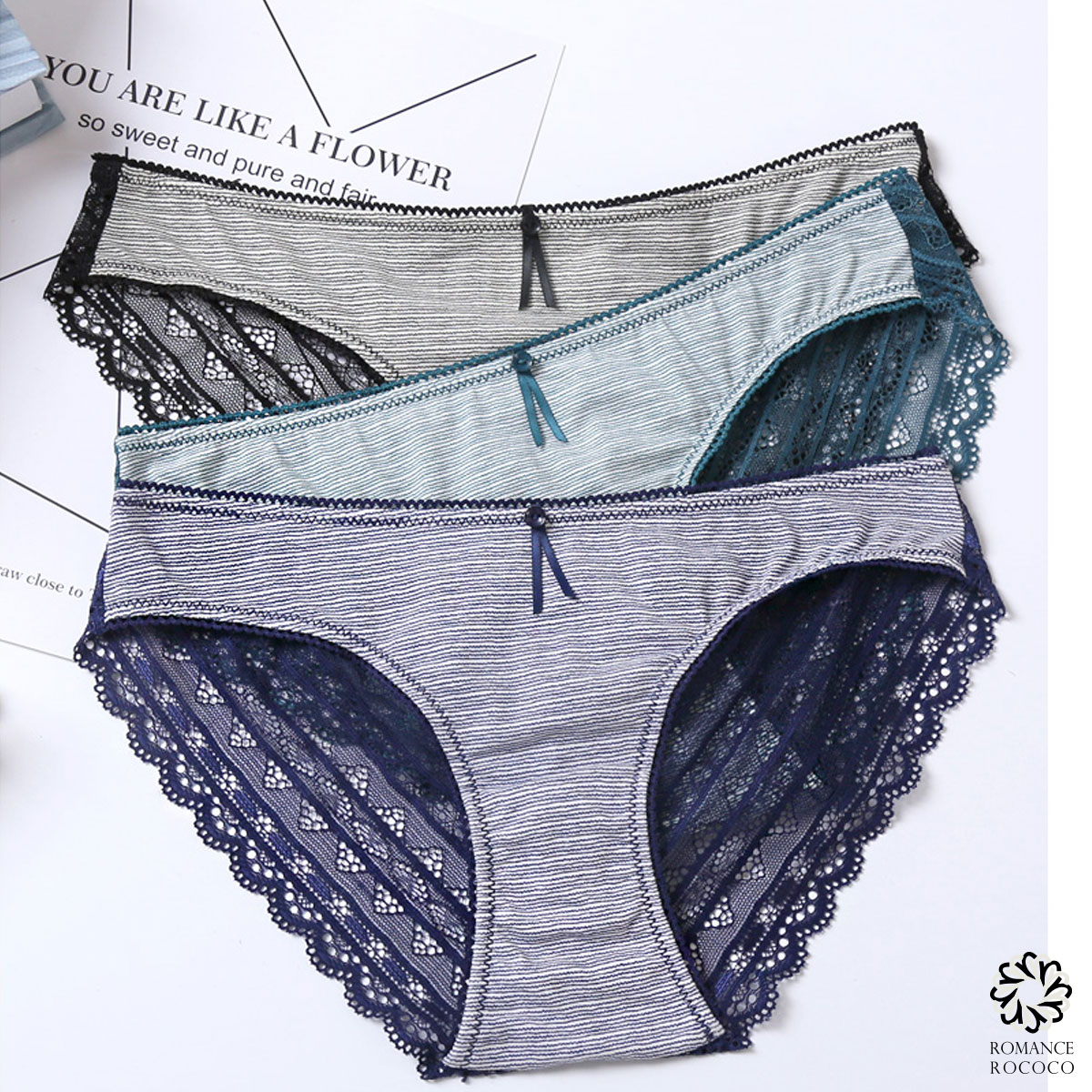 ピンクディア(PINKDEAR)ならロマンスロココ(Romance Rococo)インポートらしいカラーが魅力的!程よいセクシーが得意なデイリーブランド! ピンクディア(PINKDEAR)のコットンレースボーダーショーツです。総レースのバックスタイルがセクシーな綿ショーツ。レースとの組み合わせでカジュアルになりすぎず、GOOD!!ボーダーは波型でオシャレ。ウエストのボタンとリボンがアクセントバックレースでショーツのラインも出にくく、デイリーユースにもぴったりです!!品番 p9701 内容 ショーツ サイズ S M L カラー ブラック グリーン ネイビー 素材 綿95% ポリウレタン5% 仕様 ショーツクロッチ付きフロント透け感なしバック透け感あり