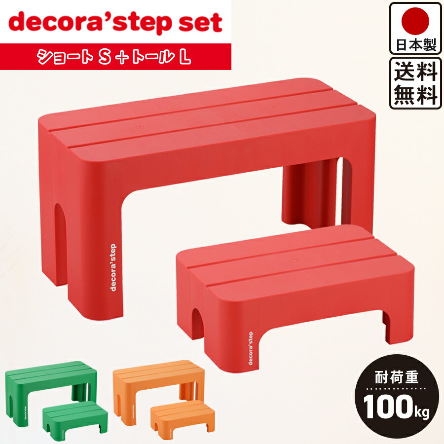 【送料無料】【2個セット】デコラステップ ショートS + トールL サイズ 2個 同色 セット / レッド オレンジ グリーン / 滑り止め ステップ台 大 小 スツール 踏み台 / キッチン 高所 屋内 屋外 玄関 / SS:幅39.5cm TL:幅59cm 奥行28cm SS:高さ14cm TL:高さ30cm【日本製】