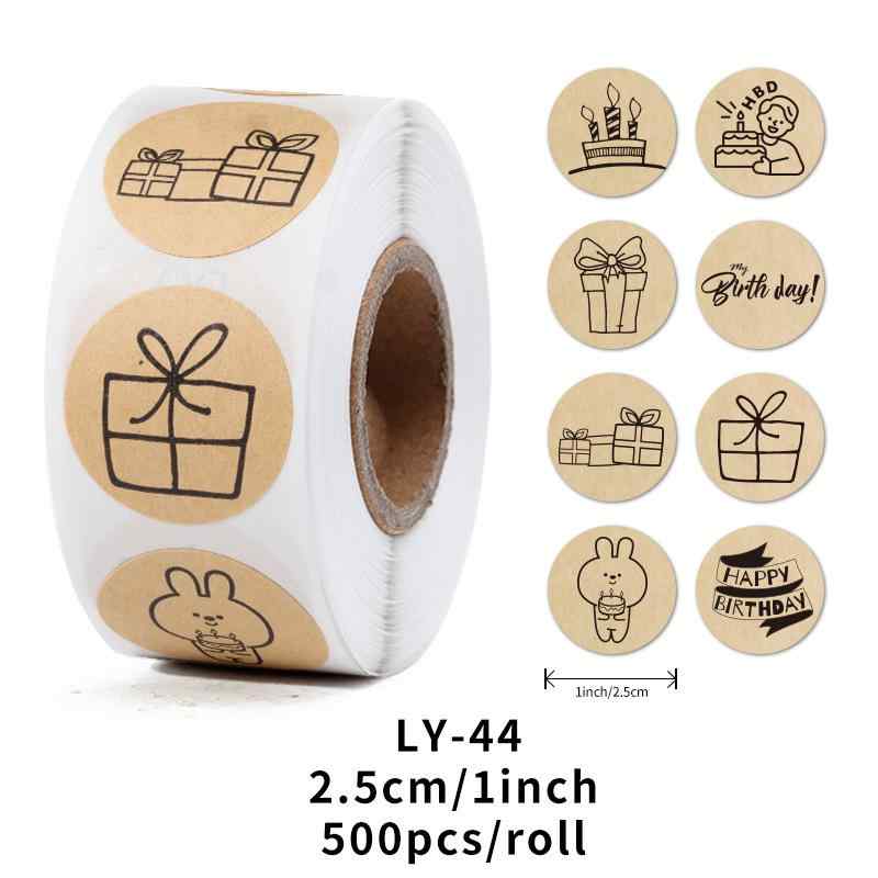 ステッカー シール ありがとう 誕生日 バースデー 牛皮紙 ラッピング 封緘 500枚・形状: 円形・素材: 牛皮紙・用途: 封口・粘着剤: 水糊・剥離紙: グラシン紙・耐熱性: 80℃・厚さ: 0.08mm・色: LY-44, LY-45, LY-46, LY-47, LY-48・サイズ: 2.5cm*2.5cm*500枚/巻