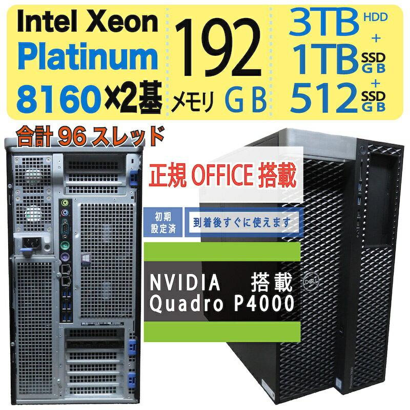 【最強 96スレッド Dell T7920・ワークステーション】◆ DELL Precision 7920 Tower◆ Xeon Platinum 8160 ×2基 合計96スレ / 1.5TB(SSD) + 3TB(HDD) / メモリ192GB◆ Quadro P4000 ◆ win11 For Workstation◆3ヶ月保証 中古PC 中古