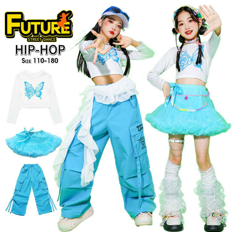キッズダンス衣装セットアップヒップホップへそ出しトップス女の子長袖蝶柄k-pop衣装青水色カゴーパンツ青パンツスカート女の子ふんわりチュールスカートk-pop衣装韓国アイドル衣装演出服ストリート発表会HIPHOPダンスウェアステージ衣装