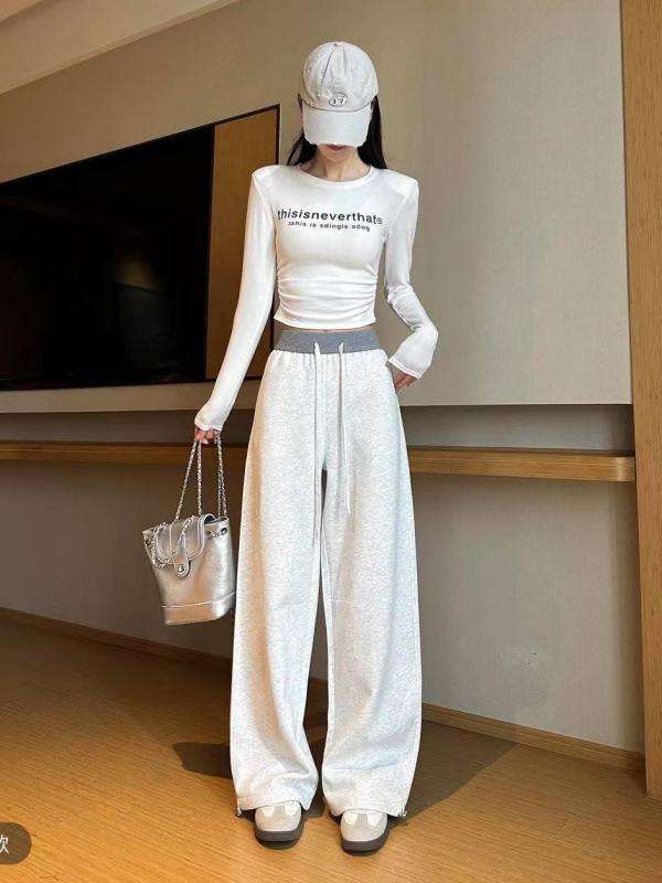 パンツ レディース 春 高見え 雪花グレー スポーティミックス 配色ステッチ ハイウエスト ストレート 伸縮性 リラックス イージーパンツ 普段使い