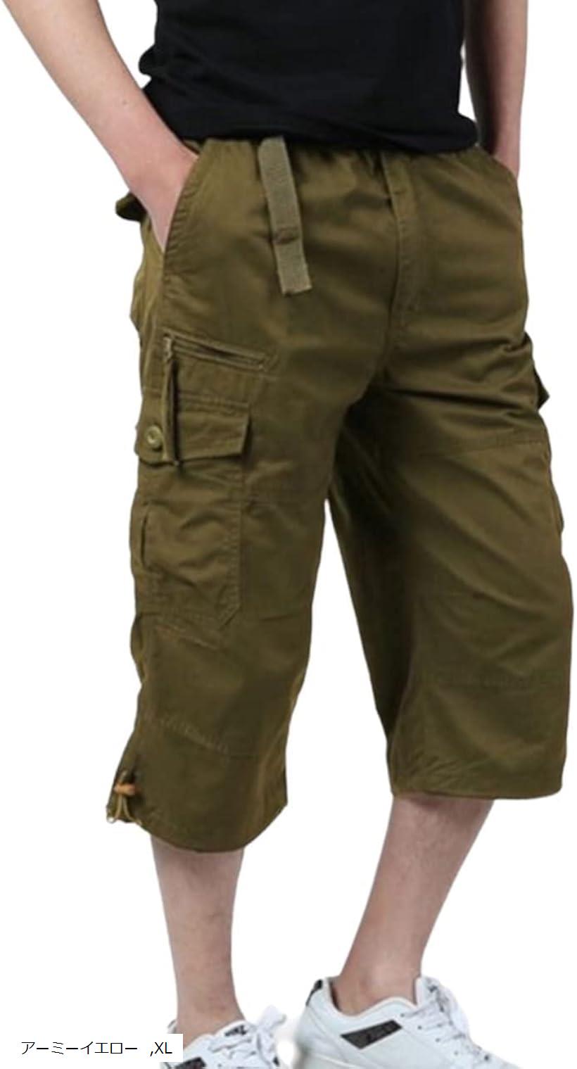 カーゴパンツ 7分丈 ミリタリー メンズ ボトムス 無地 ズボン スポーツ アウトドア 大きいサイズ 春 夏 涼しい ゆったり ワイド リラックス XLサイズ(アーミーイエロー, XL)