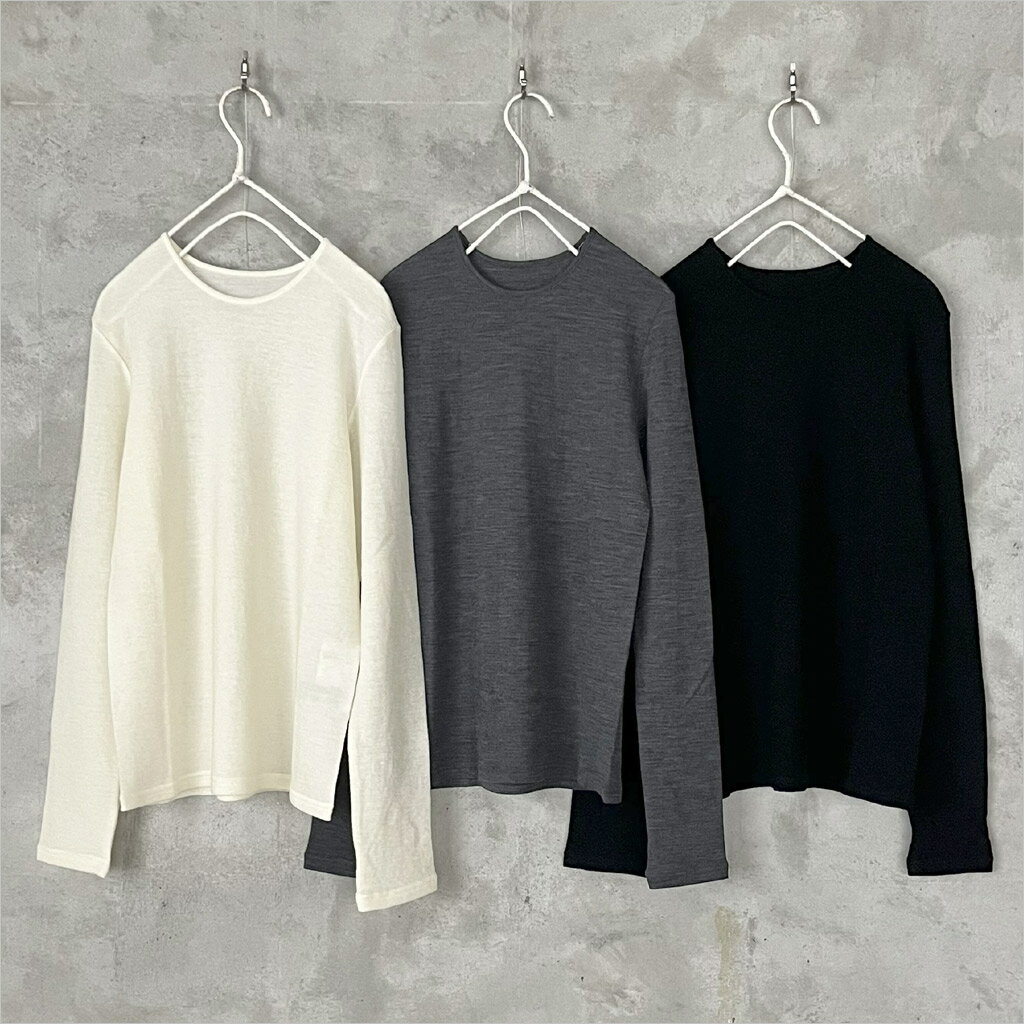 *サイズ・色は実物と多少異なる場合がございます *画像の無断転用・転載はお断りいたします *実店舗でも販売しておりますので「在庫あり」表示でも 売り切れている場合もございます *本商品はご注文タイミングやご注文内容によっては 購入履歴からのご注文キャンセル、修正を受け付ける ことができない場合がございますニュージーランドの雄大な自然で育った メリノ羊のウール100%の柔らかなリブカットソー。 極細の繊維長の長いウールを使用しているため 素肌に着ていただいても全くチクチクしません。 ドイツメーカーの古い機械でゆっくりと編み立てるので ふわっと柔らかな肌ざわりです。 丸胴編みというシームレスな編立を使用していますので 身頃に縫い目がなくストレスを感じずに 着用していただけます。 一見細く見えますが、柔らかい伸びが体を締めつけず ご自身のサイズにゆったりと自然にフィットしてくれます。 もともとウールには抗菌作用があるので、 汚れにくく、匂いもつきづらく吸湿速乾、保温性、 通気性もあるという大変高機能な素材です。 防縮加工も施されていますので ご家庭でのお洗濯も可能です。 袖丈、着丈がしっかり長めに作られた クルーネックのロングスリーブ。 1枚着としてはもちろん、インナーとして、 首元や袖口から覗かせても 良い感じの見え方でおすすめです。 *品番 : 780147 *素材 : ウール100% *COLOR : off white (オフホワイト) / charcoal (チャコール) / black (ブラック) *SIZE : 1(ワンサイズ) 肩幅23~約35cm 身幅22~約40cm アームホール36cm 袖丈65cm 袖口幅5~約9cm 着丈64cm 裾幅22~約42cm よく伸びる素材です。 軽く引っ張ったところで採寸してありますが 伸びにまだ少し余裕があります。 おおよそのサイズですが参考になさって下さい。 *made in Japan