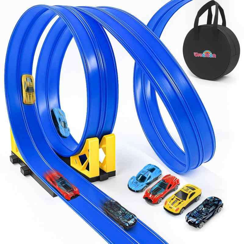 Dreamon カートラック 5m フレキシブルレール プラスチックミニカー4台 スロープ2個 収納バッグ付き 車 おもちゃ 子供用 知育玩具 男の子 女の子 人気 誕生日プレゼント