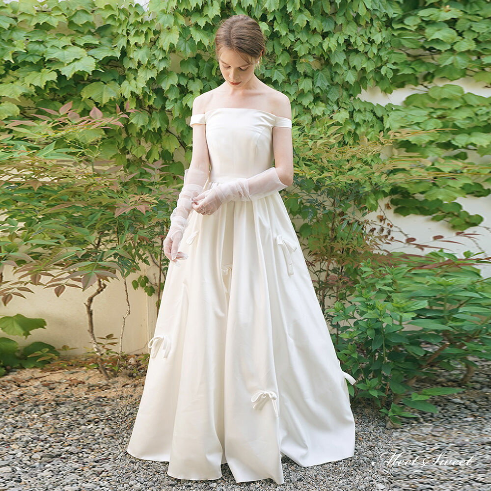 【P2倍+MAX2000円クーポン 12/11 1:59まで】ウェディングドレス ウエディングドレス ロングドレス 二次会 結婚式 前撮り ブライダル 花嫁 Aラインドレス オフショルダー サテン リボン 編み上げ 海外挙式 フォトウェディング オフホワイト wedding dress