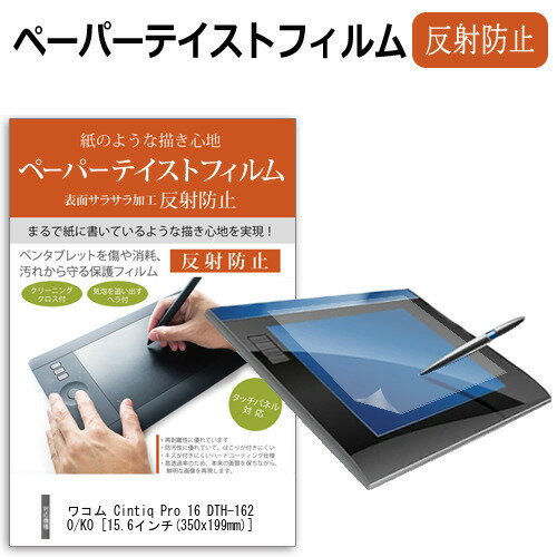 【対応機種】:WacomCintiqPro16(DTH167K/DTH-1620/K0)用【ケント紙のような書き心地を忠実に再現】:本フィルムとタッチペンを使うとケント紙に鉛筆で書いている様な書き心地です。紙の抵抗感と摩擦係数をフィルムで実現しました。【ペン先摩耗低減】:一般的なペーパータイプフィルムに比べ、ペン先の摩耗を50%低減することができます。※抵抗感は多少低下します。 【耐久性】:耐擦傷性試験にて、500gのスタイラスペンで5000回の筆記試験を行っても品質の劣化は認められませんでした。【反射低減】:フィルムは光の反射を抑えるアンチグレア(ノングレア)の特性があります。※透明感を求めるユーザーには向きません。 【気泡ゼロ】:特殊なシリコン吸着素材を採用。指やカードで簡単に押し出すことができます。貼り付け失敗した場合でも、はがして貼り直しが可能です。※ホコリが立ちにくい場所で拭き取りシート、クロス、ホコリ除去シールを使用し、ホコリを完全に除去してから貼り付けてください。 【フィルム貼り初心者様歓迎】:フィルムを綺麗に貼れるよう『充実の付属品』でサポートいたします。