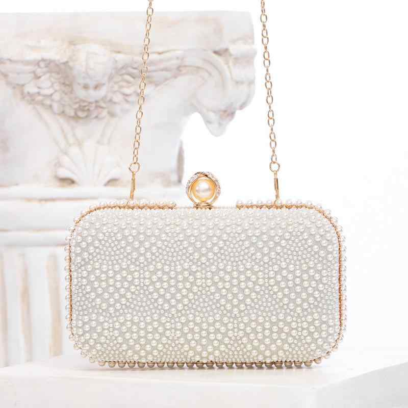 鞄 レディース 手作り パール ボックス型 チェーン クラッチバッグ フォーマル イブニング パーティー 結婚式 二次会 宴会 ショルダーバッグ 手提げ しっかりした PU素材 ホワイト 携帯収納 春夏