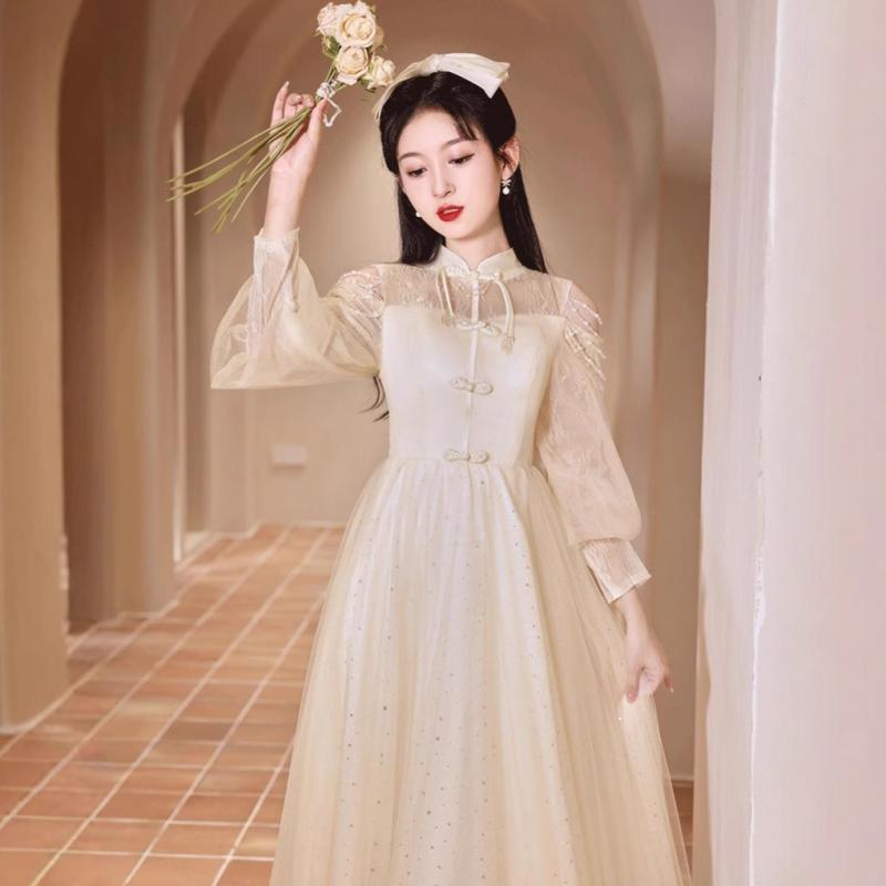 チャイナドレス レディース 高腰 A字スカート ロングドレス シャンパン色 長袖 フォーマル イブニングドレス 演奏会 発表会 成人式 パーティードレス