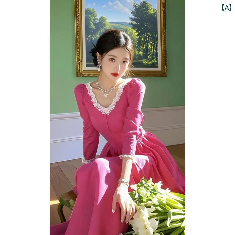 ワンピース ドレス レディース 2025年の春に登場予定の法式美人のような雰囲気漂うレース装飾のVネックでウエストを引き締めたロングスリーブのワンピースドレス。