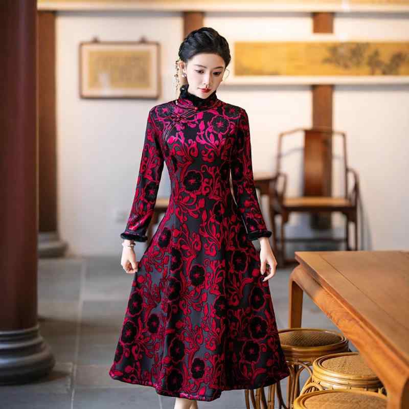 チャイナドレス レディース 秋冬 裏起毛 厚手 ママ ミセス 高級感 エレガント 上品 レトロ クラシカル 改良 スタンドカラー 斜め襟 パイピング 微ストレッチ 長袖 ロング丈 ワンピース