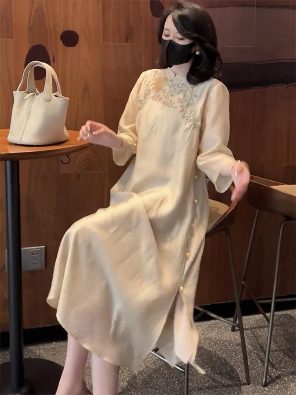 ・カテゴリ: ワンピース・柄: 無地・スタイル: チャイナドレス風・袖丈: 長袖・ネックライン: スタンドカラー・素材: シルク・裙型: Aライン・着丈: ロング・ウエスト: ゆったり・色: アプリコット・サイズ: S, M, L, XL, 2XL・工艺: 刺繍, ポケット, ボタン