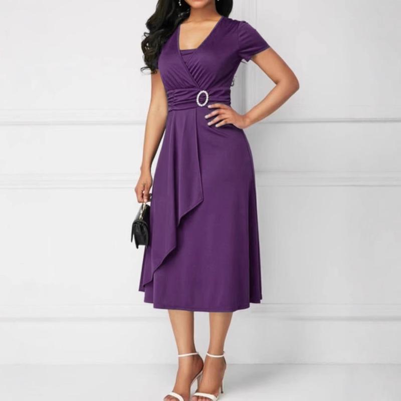 ・素材: ポリエステル、スパンデックス・柄: 無地・スタイル: 通勤・袖丈: 半袖・ネックライン: Vネック・スカート丈: ミモレ丈・スカートタイプ: Aライン・ウエスト: ミドルウエスト・色: ブラック、レッド、ブルー、グリーン、パープル・サイズ: S、M、L、XL、2XL、3XL、4XL、5XL・その他: 膝下丈、半袖
