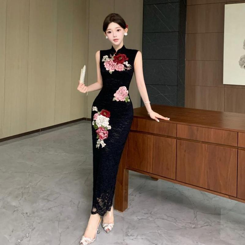 ワンピース レディース 新中式 チャイナドレス レトロ 刺繍 花柄 ブラック 黒 ロングワンピース 气质 通勤