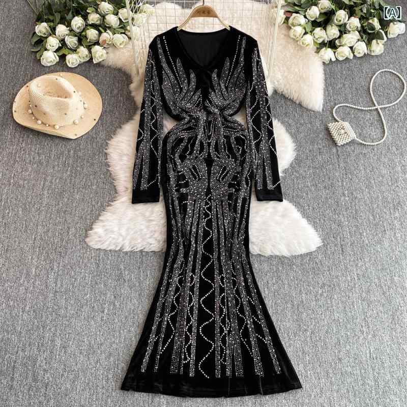 ワンピース レディース 欧米スタイル チュール ラインストーン セクシー ハイウエスト 美シルエット スリムフィット 着痩せ効果 マーメイドライン ロング丈 トレーン パーティードレス イブニングドレス フォーマル