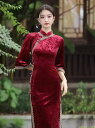 チャイナドレス レディース ワインレッド ベルベット ポリエステル レトロ モダン 改良型 スタンドカラー 斜め襟 細身 ロング丈 七分袖 普段使い デイリーユース 春秋