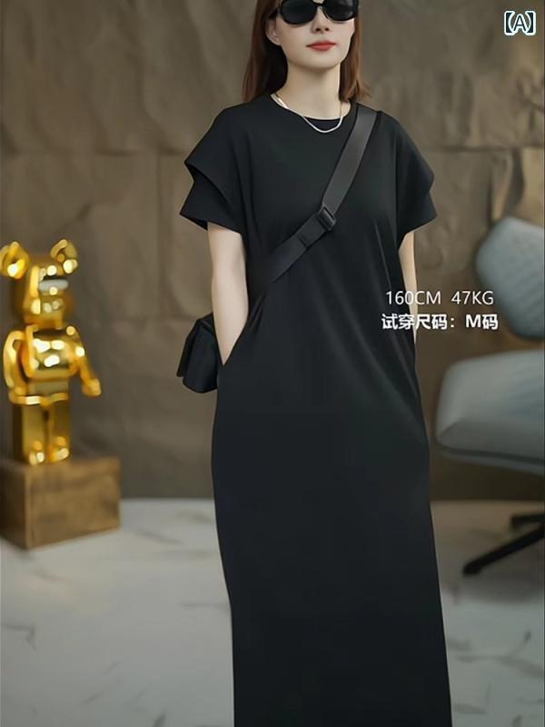 かわいい レディース ロンT 高級 感の ある の カジュアル 黒の ドレスの レディース 夏の ファッション ゆったり 肉を カバー 無地 ロング Tシャツ ドレス