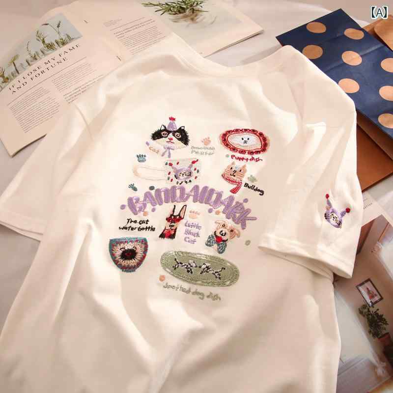 Tシャツ レディース かわいい アメリカ ストリートの 綿の かわいい 大学 重い の 刺繍の 半袖 Tシャツ メンズ レディースの 夏の ゆったりした トップ