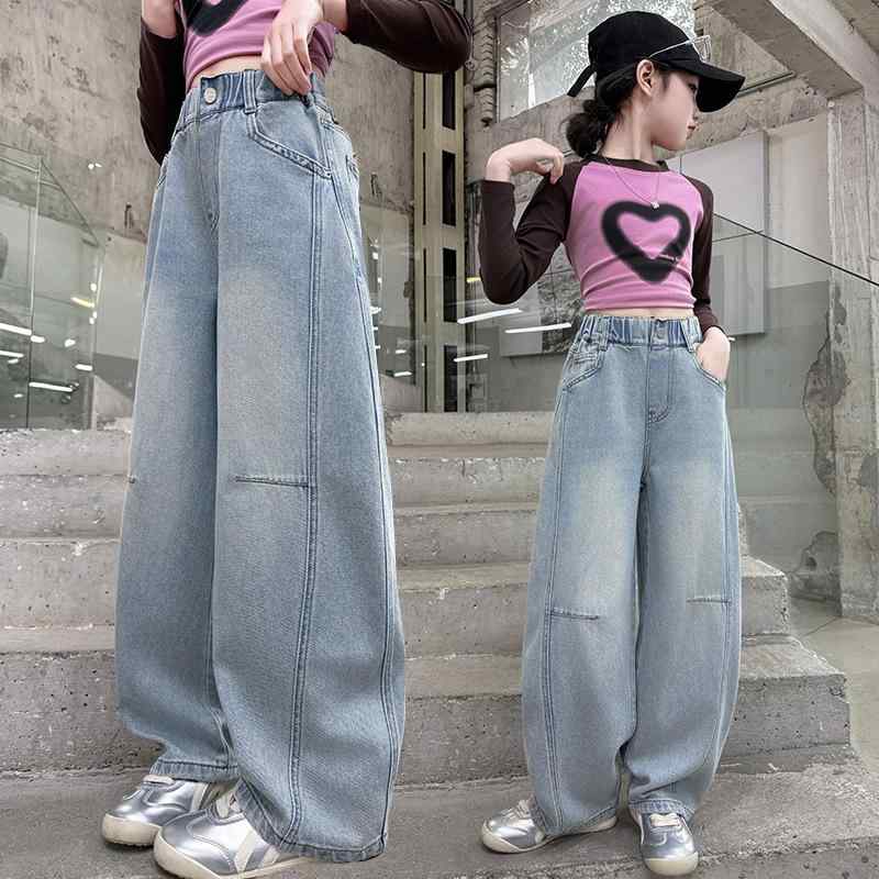 デニムパンツ 女の子 キッズ ガールズ ジュニア 中学生 ハイウエスト ゴムウエスト 柔らかな肌触り カーブ ワイドシルエット ウォッシュ加工 春秋 通学 カジュアル