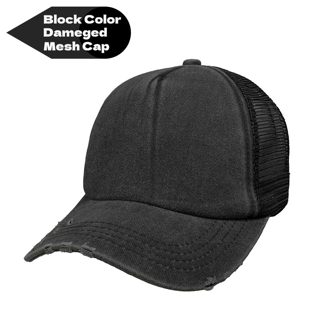 【ネコポス対応】ブロックカラー ダメージ加工 スポンジ メッシュ キャップ - ブラック/na/bu block color dameged mesh cap メンズ レディース 帽子 カーブ バイザー フリー 日除け 熱中症 屋外 アウトドア ベースボール プロファイル ユニセックス 普段使い トラッカー