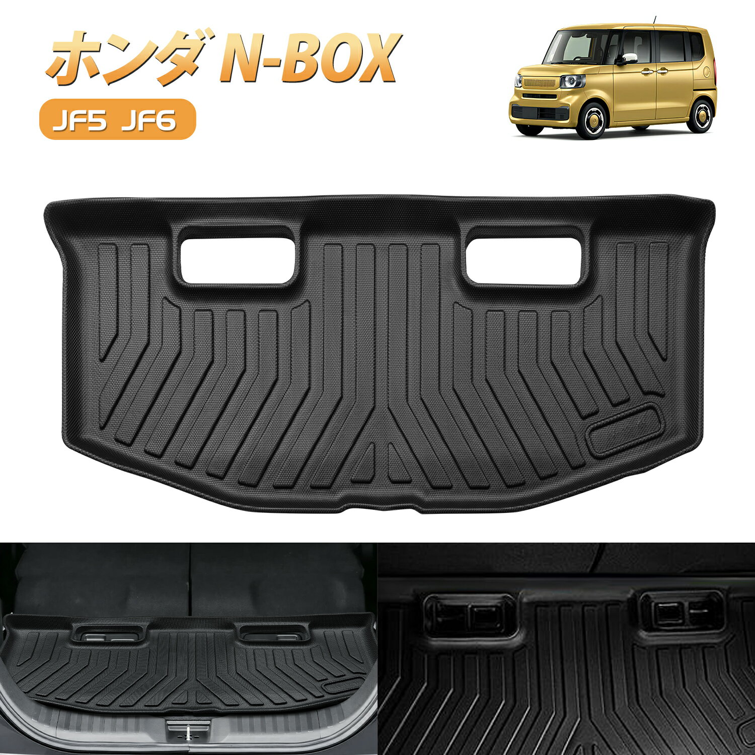 商品詳細🚗車種: 新型 ホンダ N-BOX JF5/6 適合年式 :2023年10月~ (令和5年10月~) ※年式・グレード・オプション等により適合しない場合が御座います。 形状をご確認の上ご注文お願い致します。 🚗車種: ホンダ N-BOX JF3 JF4型 (2代目) 年式:2017年9月1日~現行 (H29.8~) 【商品素材】 ・高品質TPE 【セット内容】 ・ラゲッジマット 1枚 ※4WD車には適合いたしません。 ※年式・グレード・オプション等により適合しない場合が御座います。 形状をご確認いただいた上、お買い求めください色ブラック【優れた材質】🚗TPE製(熱可塑性エラストマー) ゴムとプラスチックの中間的な材質です。 耐水性/対汚性/対候性/耐熱性に優れ、高温になりがちな車内でも問題なくご利用可能です。 付着した泥汚れなども布、タオル等で簡単に拭き掃除できます耐摩耗性、耐水性も優れています。 表面に凸凹デザイン、滑りにくさと貼り付きにくさを両立。【3Dの立体デザイン】🚗3Dの立体デザインで縁部分は数センチの立ち上がりがあるので水や汚れをしっかりキャッチ! 完全防水なのでお手入れも簡単! 水や汚れは軽いものならウエスなどで拭くだけでOK! 全面的に汚れた場合は丸洗いも可能なので衛生的です。 新素材の熱可塑性エラストマー(TPE)を使用。 弾力があり、曲げたりすることも可能なので、お車からの取り外しも容易です。【清掃簡単】車中泊やキャンピングする場合、荷物をラゲージマットに置くことで、お車を汚さないです。また、汚れたラゲッジマットは布で拭くか、水で洗い流すか素早くきれいに清掃できます。【多用途】ラゲッジマットを使用し、ラゲッジスペースと荷物を傷、汚れ、水から守ります。軽量で持ち込みやすいので、アウトドア、キャンプするとき、レジャーシートとしても使えます。【ご注意】発送サイズ規定の関係により商品を丸めた状態で発送いたします、多少の折り目や癖、変形などをご許容いただきます。数日しても癖が取れない場合やすぐに癖を取りたい場合はドライヤーを軽く当てて温め、手で揉むようにすると取りやすくなります。なお、作業の際は温め過ぎによる変形や破損、やけどにご注意ください。関連商品はこちら【本日15%OFF!P5倍・マラソン限定】 B...4,980円~16,480円\本日!最大25%OFF!P5倍・マラソン限...6,280円\本日!最大25%OFF!P5倍・マラソン限...6,280円