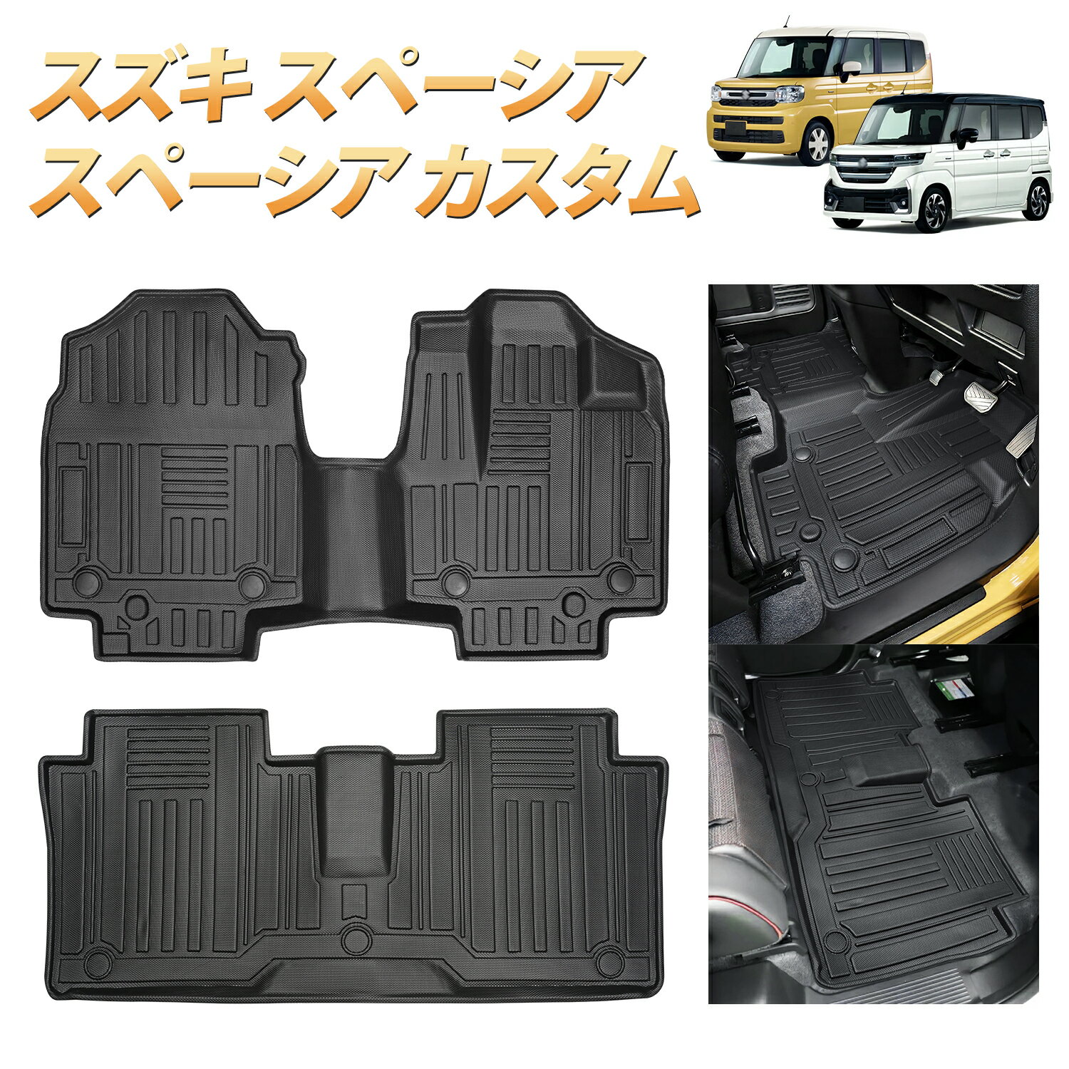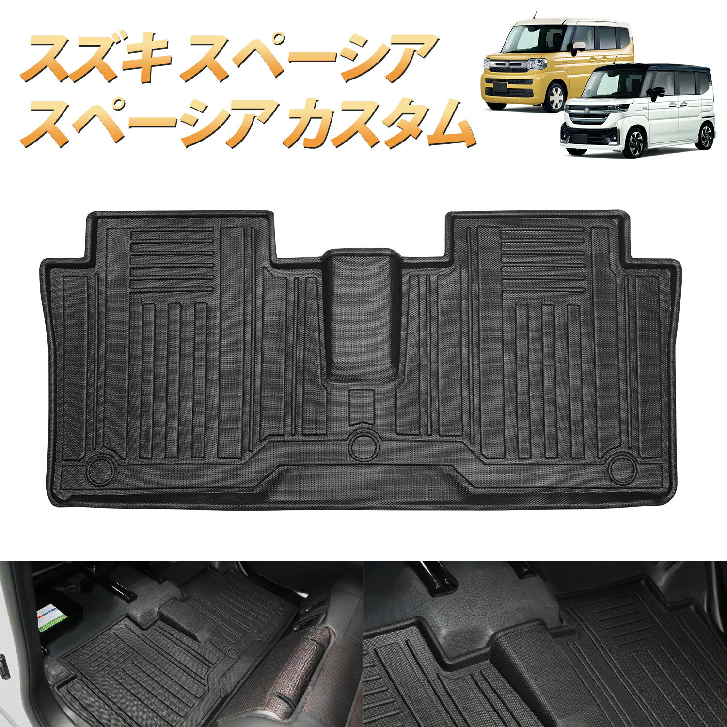 【商品仕様】スズキ スペーシア 2列目マット*1枚【適合車種】適合車種:スズキ スペーシア/スペーシア カスタム 適合型式:MK54S MK94S 適合グレード:全グレードに適合 適合年式:2023年11月~現行 ※年式・グレード・オプション等により適合しない場合が御座います。 形状をご確認の上ご注文お願い致します。【優れた材質】🚗TPE製(熱可塑性エラストマー) ゴムとプラスチックの中間的な材質です。 耐水性/対汚性/対候性/耐熱性に優れ、高温になりがちな車内でも問題なくご利用可能です。 付着した泥汚れなども布、タオル等で簡単に拭き掃除できます耐摩耗性、耐水性も優れています。 表面に凸凹デザイン、滑りにくさと貼り付きにくさを両立。【3Dの立体デザイン】3Dの立体デザインで縁部分は数センチの立ち上がりがあるので水や汚れをしっかりキャッチ! 完全防水なのでお手入れも簡単! 水や汚れは軽いものならウエスなどで拭くだけでOK! 全面的に汚れた場合は丸洗いも可能なので衛生的です。 新素材の熱可塑性エラストマー(TPE)を使用。 弾力があり、曲げたりすることも可能なので、お車からの取り外しも容易です。【清掃簡単】車中泊やキャンピングする場合、荷物をラゲージマットに置くことで、お車を汚さないです。また、汚れたラゲッジマットは布で拭くか、水で洗い流すか素早くきれいに清掃できます。【多用途】スペーシア フロアマット を使用し、ラゲッジスペースと荷物を傷、汚れ、水から守ります。軽量で持ち込みやすいので、アウトドア、キャンプするとき、レジャーシートとしても使えます。【梱包ご注意】🌟発送サイズ規定の関係により、本製品を折ったり巻いたりして発送しますので、多少の折り目や癖、変形などをご許容いただきます。 商品到着後は折り目が残る場合もございますが、弾力性の高い素材ですので時間がたてば元の形状に戻ります。 数日しても癖が取れない場合、すぐに戻したい場合は、重しなどを置いて使用してください。 やすぐに癖を取りたい場合はドライヤーを軽く当てて温め、手で揉むようにすると取りやすくなります。 なお、作業の際は温め過ぎによる変形や破損、やけどにご注意ください。