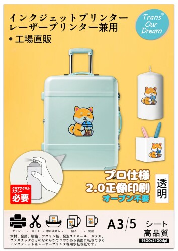 TransOurDream 真正の水転写シート A3 5枚 透明 水転写紙 クリア インクジェットプリンター&レーザープリンター共用 転写デカール デカール 自作 デカール用紙 薄型 DIY JP-8-05 転写できる素材:木、金属、樹脂、ガラス、陶器、プラスチックなど滑らかな表面があるものに転写できます。 特性:透明、転写簡単、優れた耐久性、鮮やかな色、焼く必要なし、薄型 対応プリンター:インクジェットプリンター(染料・顔料)&レーザープリンター 入数:水転写紙×5シート、取扱説明書×1シート お探しNO:JP-8-05 商品コード57078833263商品名TransOurDream 真正の水転写シート A3 5枚 透明 水転写紙 クリア インクジェットプリンター&レーザープリンター共用 転写デカール デカール 自作 デカール用紙 薄型 DIY JP-8-05型番JP-8-05カラー兼用‐透明※他モールでも併売しているため、タイミングによって在庫切れの可能性がございます。その際は、別途ご連絡させていただきます。※他モールでも併売しているため、タイミングによって在庫切れの可能性がございます。その際は、別途ご連絡させていただきます。