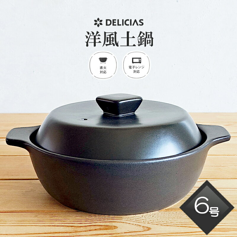 【土鍋・一人用】土鍋 6号 DELICIAS 電子レンジ対応 一人用 ブラック 1~2人用 こぶり鍋 おしゃれ(小鍋・陶器・小ぶり鍋・一人鍋・ガス火可能・電子レンジ調理器・煮込み料理・直火OK・黒色・BLACK・かっこいい・デリシアス)カクセー