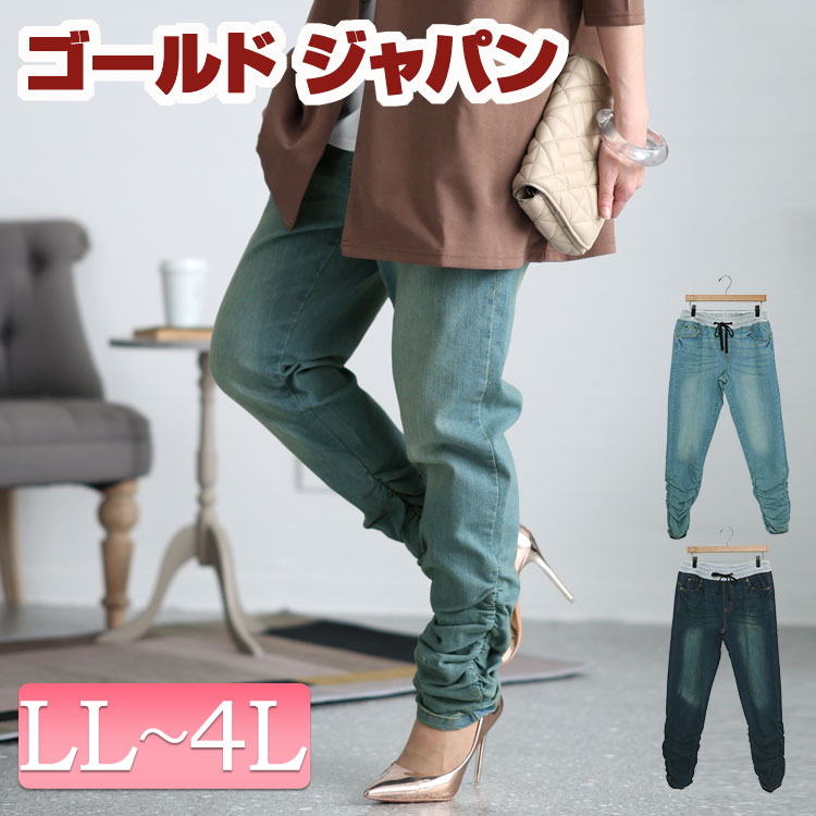 大きいサイズ レディース ボトムス パンツ ウエストリブデニムパンツ ロングパンツ デニムパンツ スキニーパンツ デニム ジーパン ロング ドロスト ウエストゴム くしゅくしゅ ギャザー ポケット 春新作 春服 秋服 夏服 冬服 LL 2L 3L 4L ネイビー ブルー ゴールドジャパン