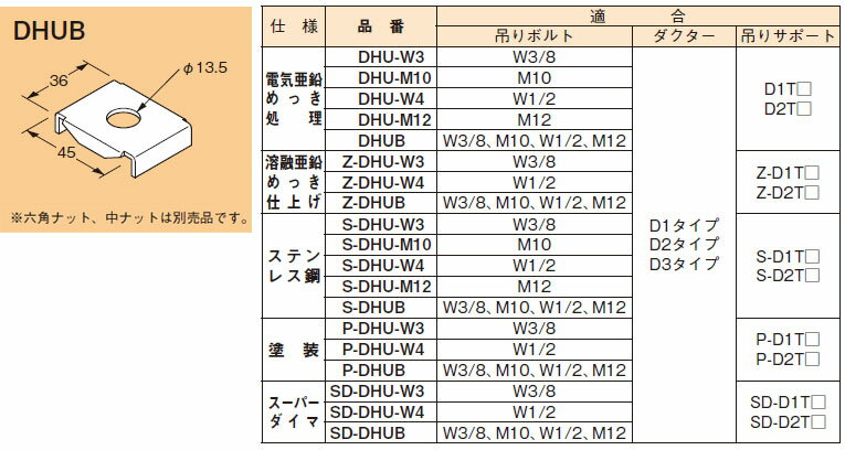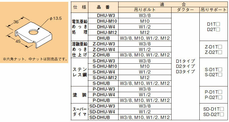 納期目安:お取り寄せ品(詳しくはこちらをクリック) ●画像は代表型番のイメージになります。型番通りの手配になりますので(色・形等)確認の上ご注文下さい。 仕様:溶融亜鉛めっき仕上げ 適合:ダクターチャンネル D1タイプ、D2タイプ、D3タイプ 吊りサポート Z-D1T□、Z-D2T□ 吊りボルト W3/8、M10、W1/2、M12 ※六角ナット、中ナットは別売品です。