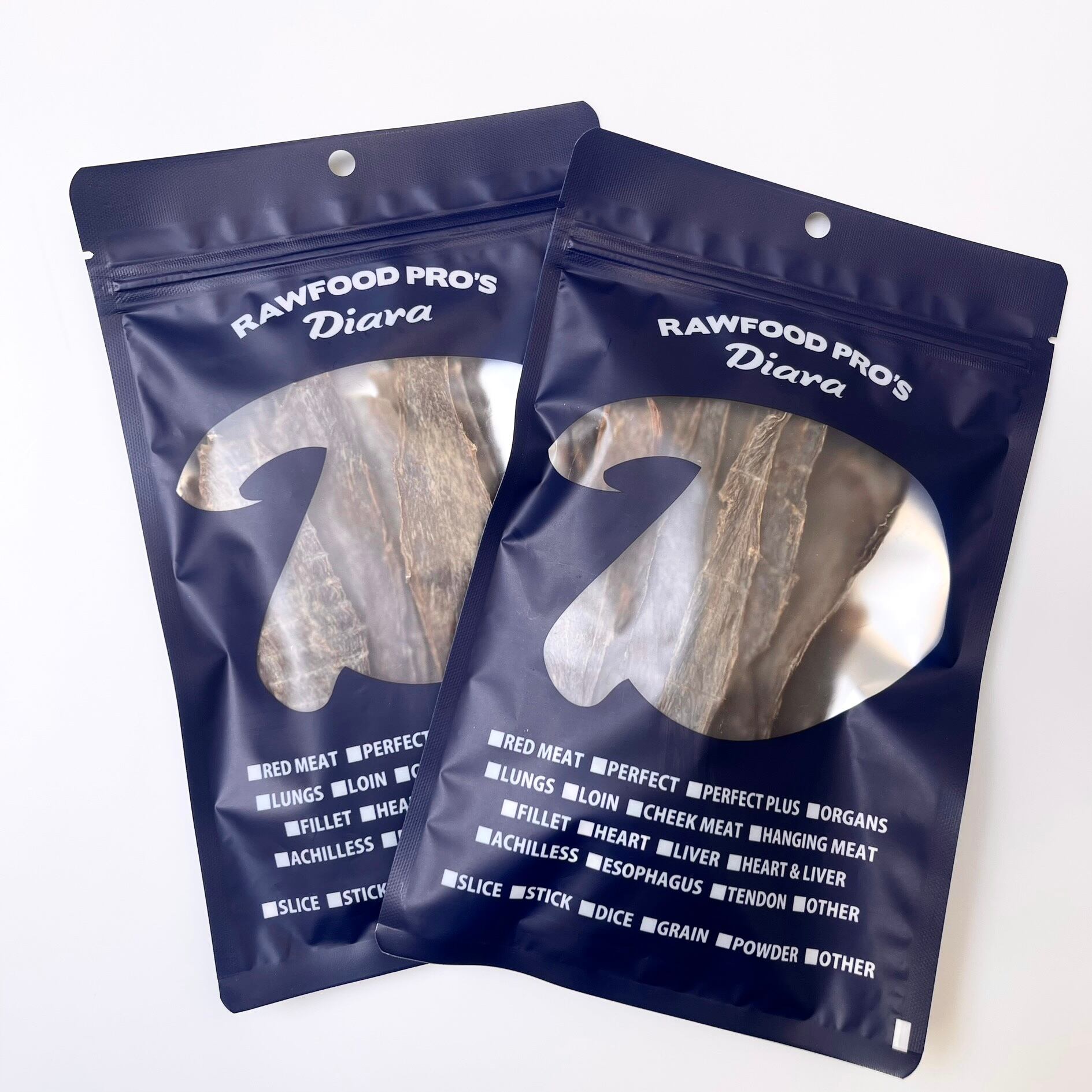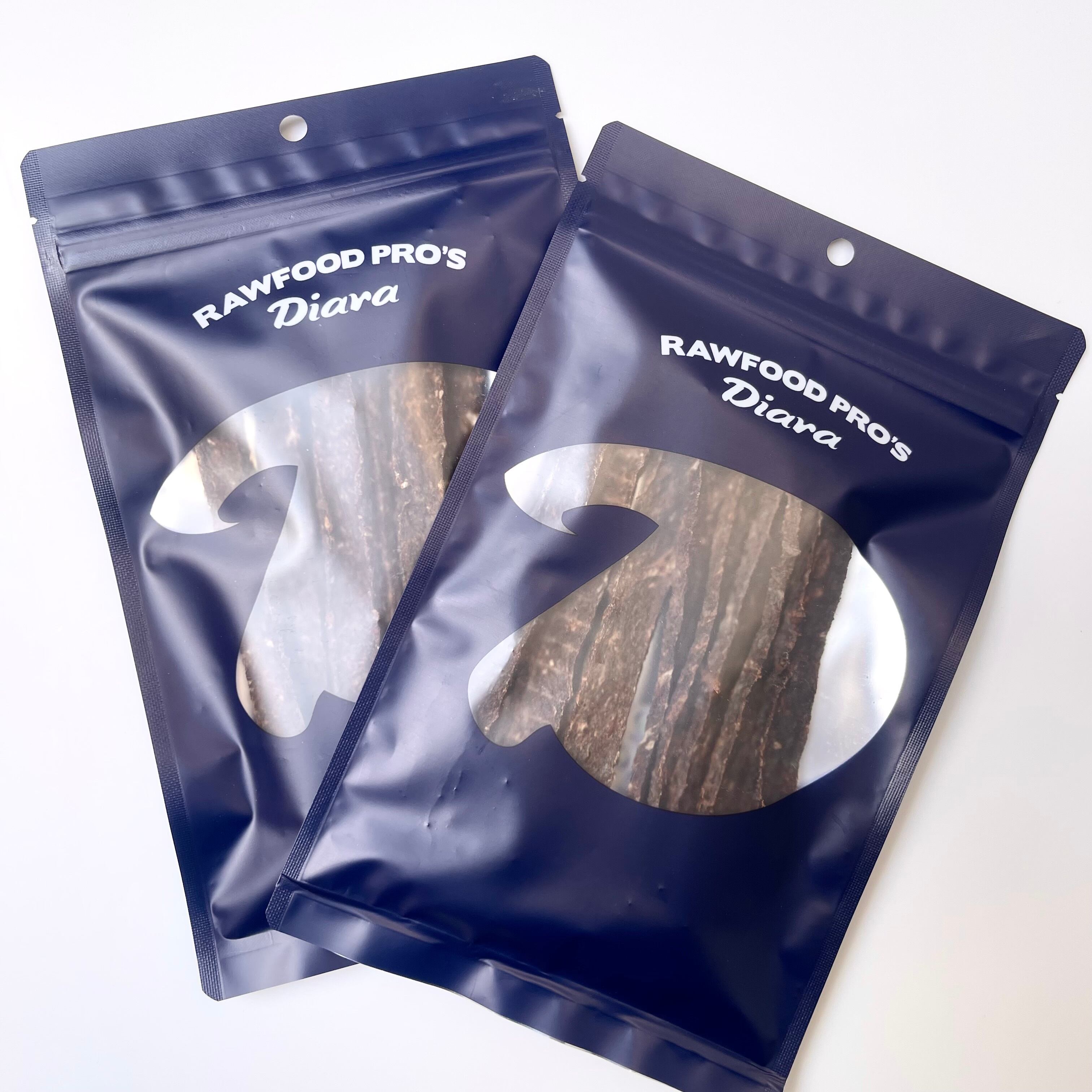 説明 一般的なドライトリーツとは一線を画す栄養価! 無駄な添加物や着色料などはもちろん一切使用していません。全体食の考えを取り入れ、新鮮な赤身肉や内臓各種、骨をバランスよくミックスしました。おでかけ時の非常食やおやつ、ご褒美などにとても便利です。 内容量 50g 原料原産国 日本、カナダ、アルゼンチン 製品加工国 日本 成分 たんぱく質60%以上、脂質9%以上、繊維1%以下、灰分5%以下、水分18%以下 賞味期限 パッケージに記載 ご注意 完全無添加のため開封後は冷蔵庫などに入れ、お早めにご使用ください。馬肉を知り尽くした馬肉専門メーカーの自信作!鮮度も品質も最高級!Diara(ディアラ)「ドライ馬肉パーフェクト スティック」 素材にとことんこだわりました。ヒト用の食材として用いられる厳選された良質の素材そのままを使い、無駄な保存料・着色料・香料など添加物は一切使用していません。 食物アレルギーの原因は、食材そのものにあるのではなく、素材に含まれる化学合成添加物にあると言われています。 馬肉専門メーカー「ディアラ」の馬肉製品は化学物質を一切含まないので、アレルギーが心配なパートナーにも安心してお与えいただけます。 【身体にやさしい食材】 低脂肪・低カロリーの馬肉ですが、気になる脂肪分は不飽和脂肪酸が豊富なので血液循環を促し美しい毛艶を形成するとされています。余計な脂質を摂取したくない犬たちにとてもやさしい食材です。 【安心安全な食材】 成長促進剤などを投与し過密状態で飼育されている食用動物が多い中、馬は広い牧草地でのびのびと抗生剤やホルモン剤などの投与もなく飼育されています。そのため、人間が生で食すことができるレベルの安心安全な食材なのです。 【信頼の食材】 日本国内をはじめ多くの海外の動物園で飼育されている肉食獣は、その野生環境の食餌に近付けるために生肉を与えられています。また、上記の理由からその「生食」に「馬肉」が使用されていることが多く、「馬肉」を「信頼の食材」たらしめています。