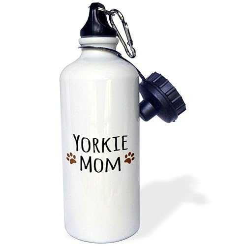 3dRose Yorkie Dog Mom-Yorkshire Terrier-Doggie By Breed-Doggy Lover Brown Paw Prints-Mama Pet Owner Sports Water Bottle, 21 oz, White