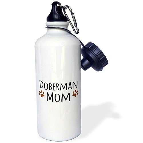 3dRose "Doberman Pinscher Mom-Doggie by breed-brown muddy paw prints-doggy lover proud mama pet owner" Sports Water Bottle, 21 oz, White
