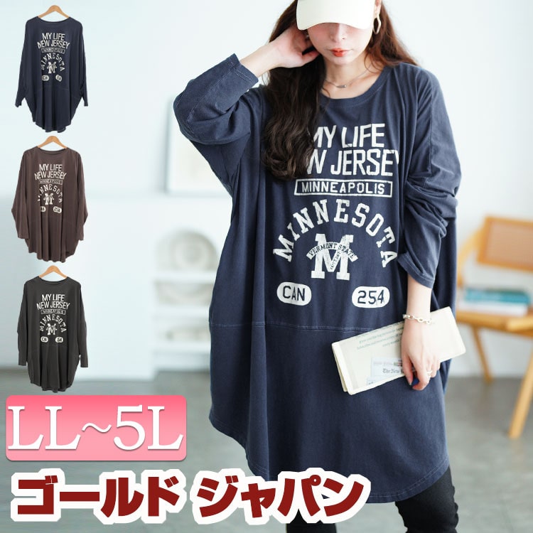 大きいサイズ レディース チュニック カレッジロゴコットンチュニック 長袖 ロング ロンT ロゴ カレッジロゴ コットン ドルマン ラウンドカット ドロップショルダー ビッグ ストレッチ 秋新作 秋服 冬服 春服 LL 2L 3L 4L 5L ブラウン スミクロ ネイビー ゴールドジャパン
