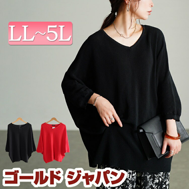大きいサイズ レディース トップス ニット セーター Vネック片畦編みドルマンニット 長袖ニット ドルマンニット Vネックニット Vネック 長袖 ドルマン ドルマンスリーブ ストレッチ 伸縮 無地 秋新作 秋服 冬服 春服 LL 2L 3L 4L 5L ブラック 黒 レッド 赤 ゴールドジャパン