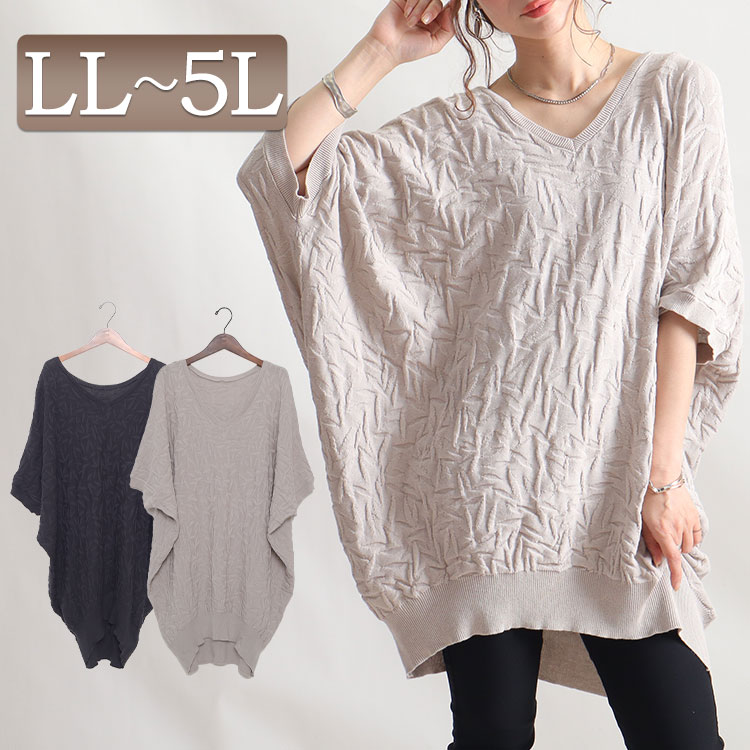 大きいサイズ レディース チュニック Vネックドルマンニットチュニック Vネック ドルマン 5分袖 ロング ふくれジャガード 立体柄 テールカット ドルマンスリーブ コクーン 柄服 リブ 無地 夏新作 春服 夏服 F フリー LL 2L 3L 4L 5L ブラック 黒 ベージュ 韓国ファッション